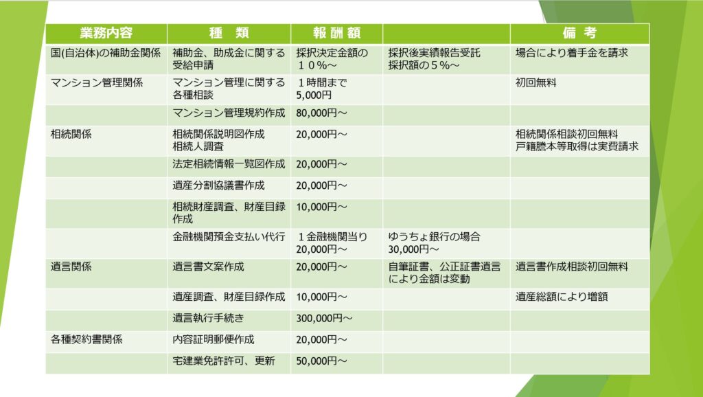 ※本表は「日本行政書士会連合会報酬額統計調査」を参考にいたしております。あくまでも一例です。 事案によっては、各許認可申請の専門家(提携している行政書士)をご紹介いたします。